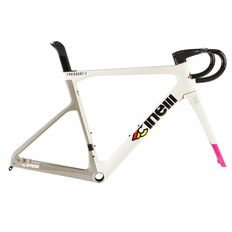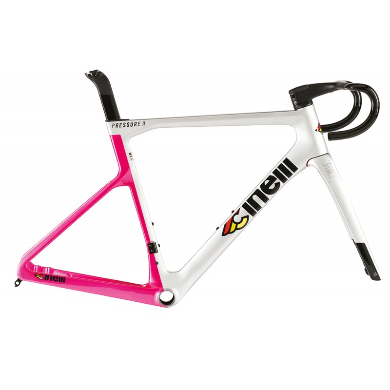 Born to race, Pressure is the pinnacle of Cinelli’s road bike design language. Obsessively re-engineered seatpost length, clamp mechanism and cable guides reduce the weight of the Pressure II framekit by 5% relative to its predecessor. Refined over 4 different samples the Pressure II’s carbon fiber layup represents what our R&D team and pro riders believe to be the best ratio between weight savings, race stiffness and reliability. In line with most recent studies in aerodynamics, rolling resistance and - most importantly - the continuous hybridization of the road bike, the Pressure II features 32mm max tyre clearance.