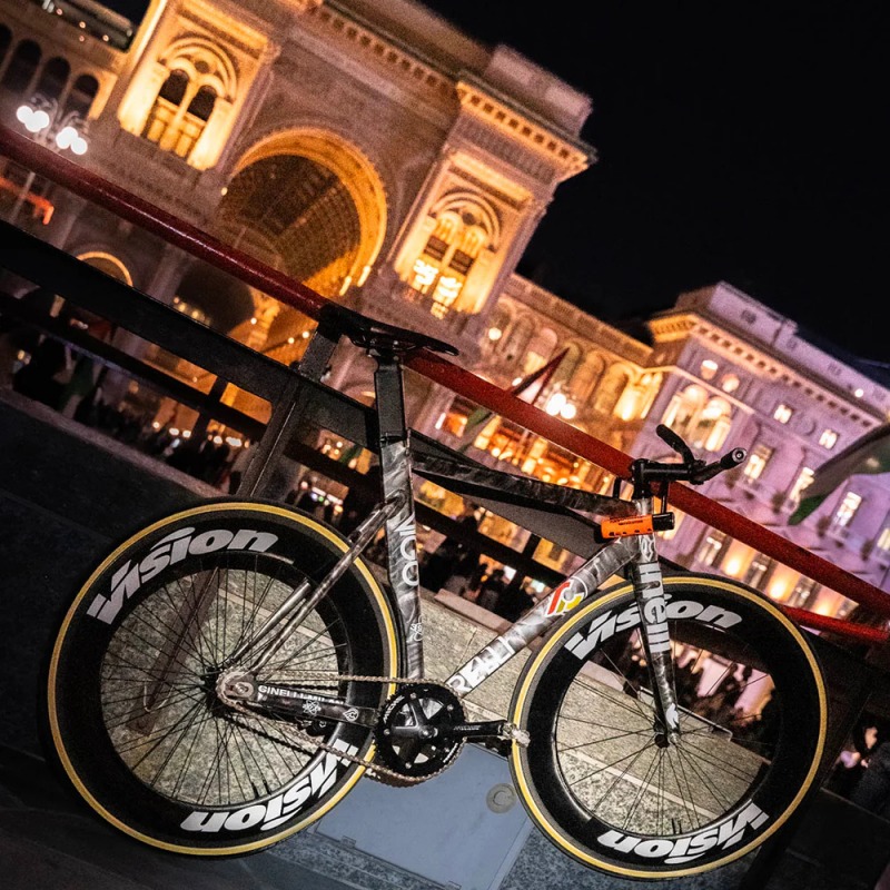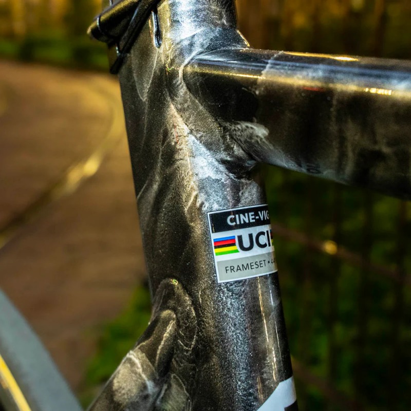 The new Vigorelli graphic concept simulates the look of a National Cycling Federation track frame that has continued to be used by many different riders (as would often occur with team bikes in national velodromes during the 70s and 80s) who have chosen to continue to add stickers and “restyle” the frame according to new trends and sponsors. Accordingly the frame offers, on top of its two-tone wet-on-wet paint, a layering of “retro” and “hypercontemporary” Cinelli logos and graphic styles.
