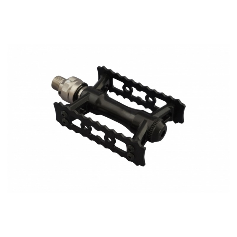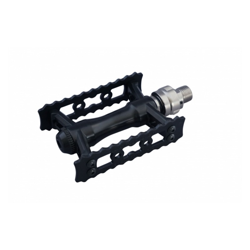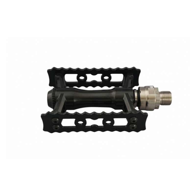 The Sylvan Touring pedal has the largest step area in the Sylvan line, offering various foot position over a 94X63mm area to prevent fatigue. The pedal is double-sided and it is compatible with toe clips and straps to prevent slipping. This pedal works well for a wide variety types of shoes, as the cage plate tooth profile is grippy but not particular aggressive.