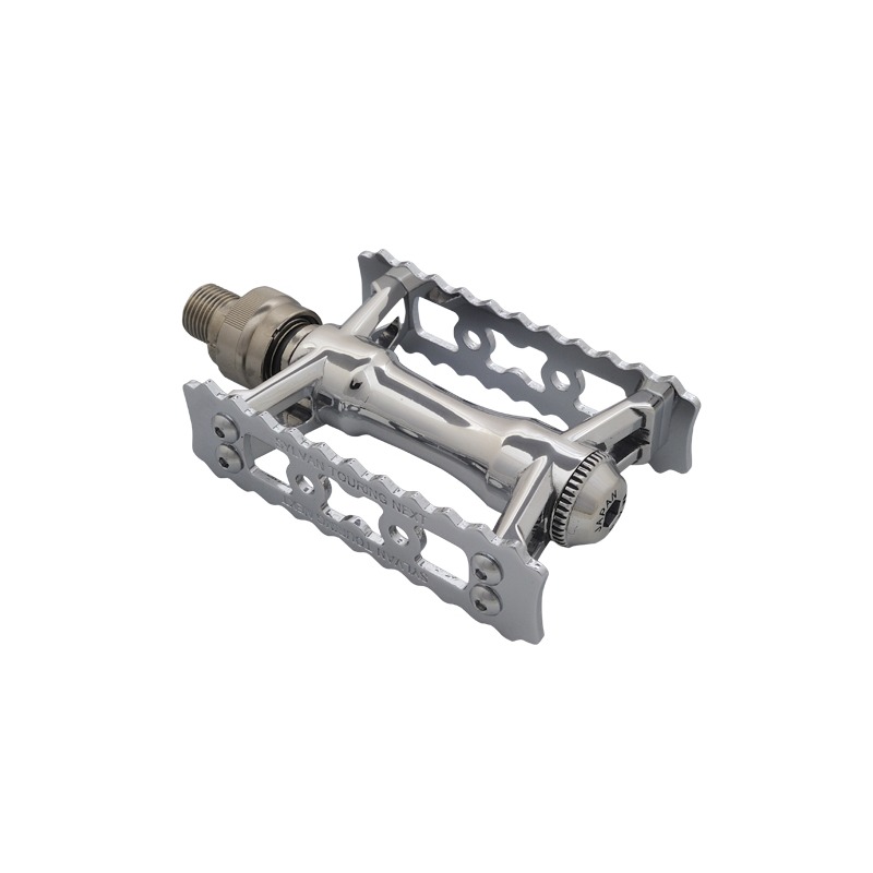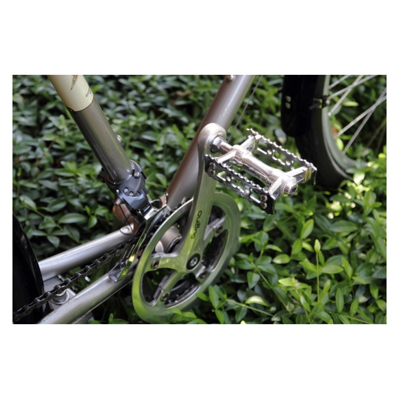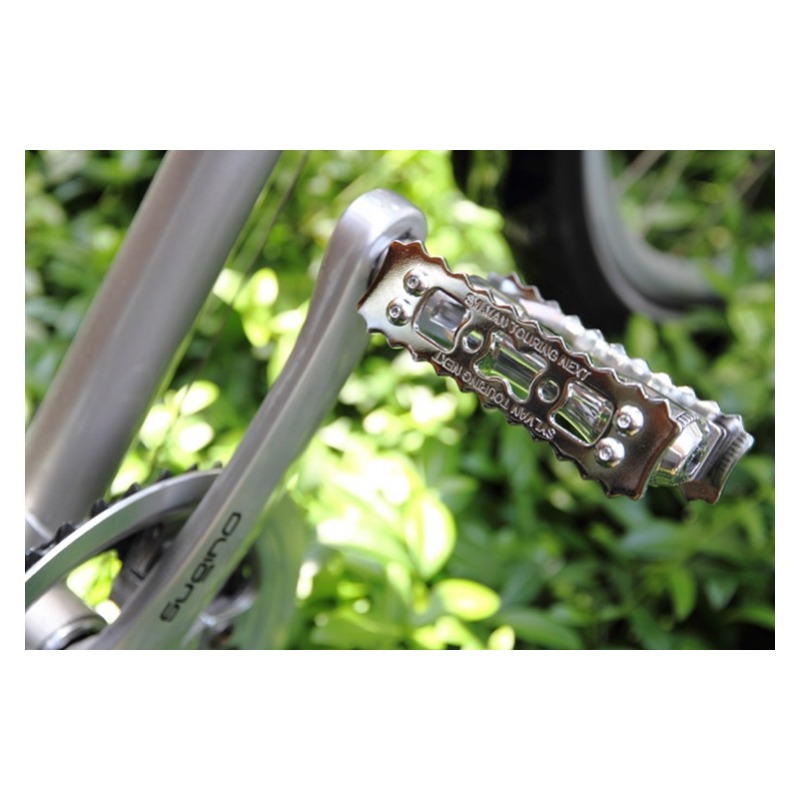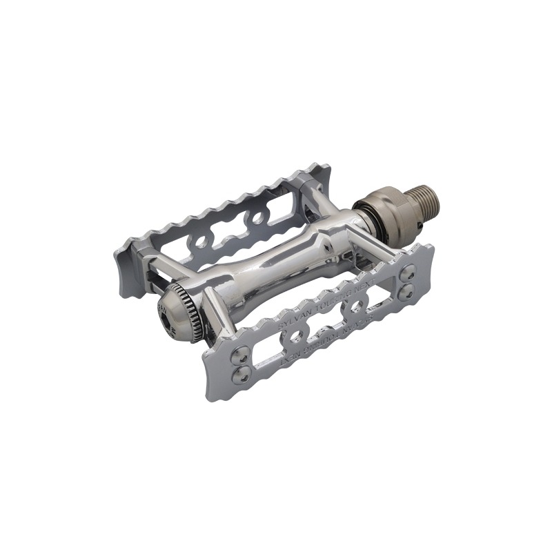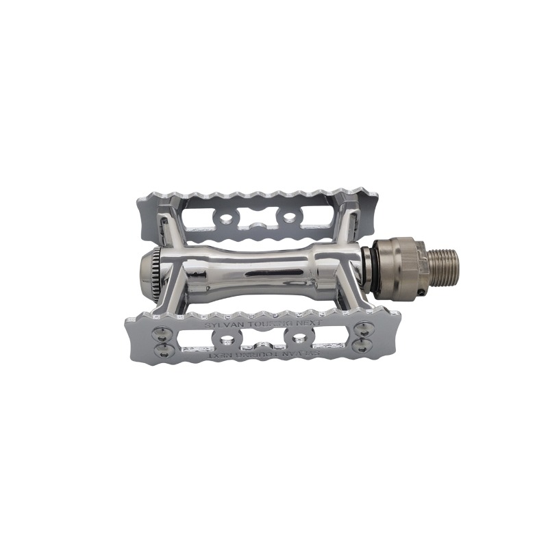 The Sylvan Touring pedal has the largest step area in the Sylvan line, offering various foot position over a 94X63mm area to prevent fatigue. The pedal is double-sided and it is compatible with toe clips and straps to prevent slipping. This pedal works well for a wide variety types of shoes, as the cage plate tooth profile is grippy but not particular aggressive.